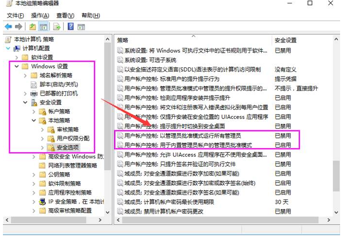 用户帐户控制:用于内置管理员帐户的管理员批准模式 设为启用;