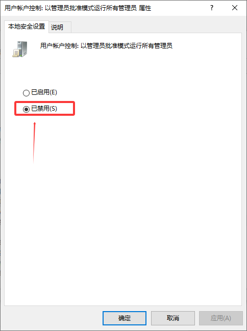 用户帐户控制:以管理员批准模式运行所有管理员 设为禁用;